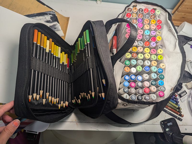 This hefty art kit includes a full range of Castle Arts color pencils (they’re decent!) and Arrtx alcohol markers (not my favorite) with a few Blick and Copic markers thrown in. It also includes a medium-sized sketchbook and a few pencils, including my beloved Prismacolor Col-Erase Pencil that I use for laying down the initial drawings.