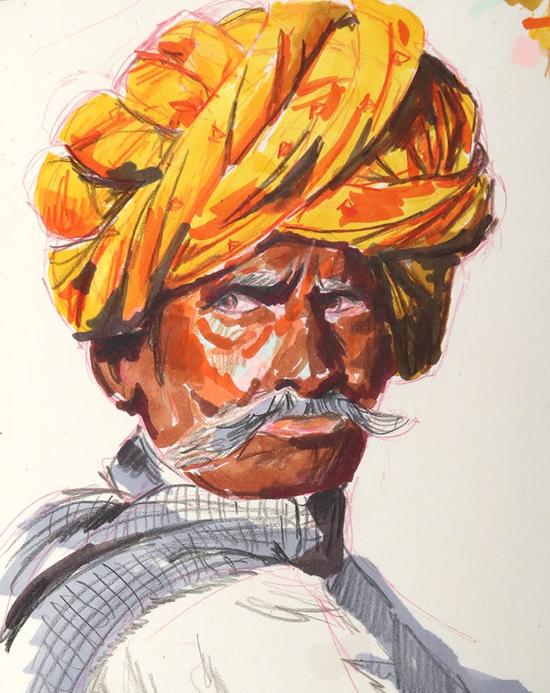 Pictured above is my little curated palette, which includes: Golden Yellow, Golden Ochre, Fast Orange, Salmon Pink, Vermillion, Periwinkle Blue, Royal Blue, Light Blue, Light Olive, Dark Olive, Russet, and Greyish Black.