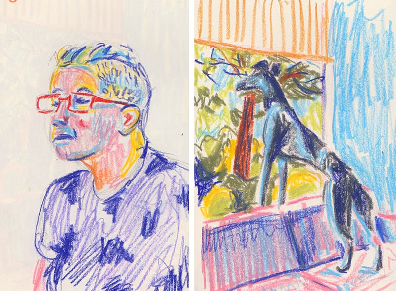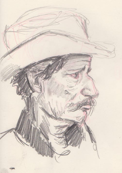 My much smaller art kit fits in my fanny pack, and while it can keep me busy when unexpectedly waiting somewhere, it is very limited. I have a smaller sketchbook, a number of pencils, pencil sharpener, and eraser. I still work on portraiture with this smaller kit, but sometimes I also try to capture the scenes around me. It’s *fine*, but also, have you seen my work? I love color! And I was really missing not having access to it with my smaller kit.