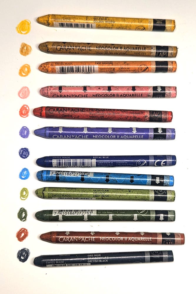 I had been hearing lots of chatter about Caran d'Ache Neocolor IIs, which are water soluble wax pastels. I really enjoy working with oil pastels, so while I was in Savannah this past August on vacation, I decided to swing into Blick and pick up a small grouping to try.